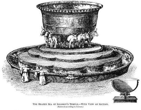 Solomon is finishing the temple in style. He has enlisted the help of an expert bronze caster. The decorations sound truly amazing. In addition to numerous bronze objects Solomon commissioned a “bronze sea”. This swimming pool sized object was filled with water and is thought to symbolize the Red Sea that was parted to save the Israelites from the Egyptians — sort of an uber baptismal.