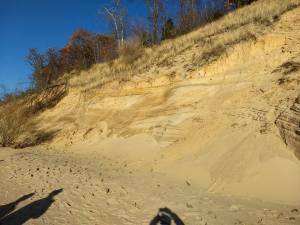 I recently led a group of students on an observational adventure along the shores of lake Michigan for a class I am teaching. We were treated to some amazing December weather and we walked along a deserted beach and marveled at erosion of dunes that have stood for thousands of years. The erosion that is occurring is the result of high lake levels, and it is revealing ancient soils and other features long hidden by vegetation and more recent sand deposits.