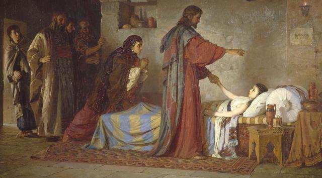 When Jesus had again crossed over by boat to the other side of the lake, a large crowd gathered around him while he was by the lake. Then one of the synagogue leaders, named Jairus, came, and when he saw Jesus, he fell at his feet. He pleaded earnestly with him, “My little daughter is dying. Please come and put your hands on her so that she will be healed and live.” So Jesus went with him. A large crowd followed and pressed around him. And a woman was there who had been subject to bleeding for twelve years. She had suffered a great deal under the care of many doctors and had spent all she had, yet instead of getting better she grew worse. When she heard about Jesus, she came up behind him in the crowd and touched his cloak, because she thought, “If I just touch his clothes, I will be healed.” Immediately her bleeding stopped and she felt in her body that she was freed from her suffering. At once Jesus realized that power had gone out from him. He turned around in the crowd and asked, “Who touched my clothes?” “You see the people crowding against you,” his disciples answered, “and yet you can ask, ‘Who touched me?’ ” But Jesus kept looking around to see who had done it. Then the woman, knowing what had happened to her, came and fell at his feet and, trembling with fear, told him the whole truth. He said to her, “Daughter, your faith has healed you. Go in peace and be freed from your suffering.” While Jesus was still speaking, some people came from the house of Jairus, the synagogue leader. “Your daughter is dead,” they said. “Why bother the teacher anymore?” Overhearing what they said, Jesus told him, “Don’t be afraid; just believe.” He did not let anyone follow him except Peter, James and John the brother of James. When they came to the home of the synagogue leader, Jesus saw a commotion, with people crying and wailing loudly. He went in and said to them, “Why all this commotion and wailing? The child is not dead but asleep.” But they laughed at him. After he put them all out, he took the child’s father and mother and the disciples who were with him, and went in where the child was. He took her by the hand and said to her, “Talitha koum!” (which means “Little girl, I say to you, get up!” ). Immediately the girl stood up and began to walk around (she was twelve years old). At this they were completely astonished. He gave strict orders not to let anyone know about this, and told them to give her something to eat. – Mark 5:21-43